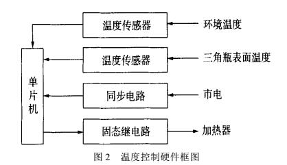 加熱器采用時(shí)間比率控制 ,調(diào)節(jié)加熱時(shí)間的占空比來(lái)達(dá)到溫度穩(wěn)定的目的。硬件框圖如圖 2 所示。